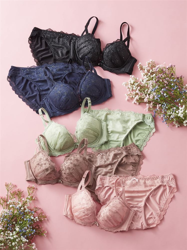 デザインの特徴 このセットは、ヨーロッパの古城に這う蔦や花をイメージしたヴィンテージライクなデザインが魅力です。レースに忍ばせたラメやラメ糸が繊細な輝きを放ち、心ときめくポイントとなっています。カラーは、デイリー使いしやすいベーシックカラーから、心華やぐカラーまで豊富に取り揃えています。